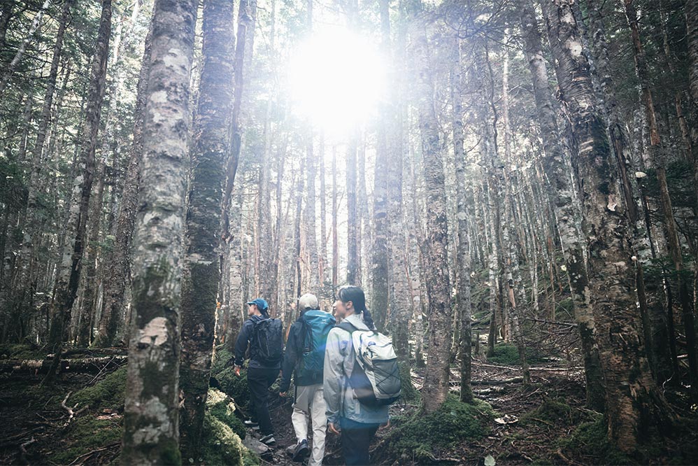 沢沿いから離れてシラビソの森の中核へ。登山道を囲うように立ち並ぶ木々が、陽の光によって白みを帯びる。森と天候がつくりだす幻想的な時間だ。
