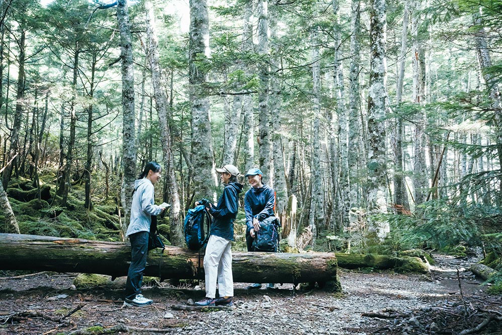 苔むした森を前に、彼女たちはうれしそうに声を上げる。そう、南アルプスは少し歩けば豊かな森に出合うことができるのだ。とくに北沢峠はバスを降りてすぐ、樹林帯のなかに入ることができるので気軽に森の散策が楽しめる好スポットだ。