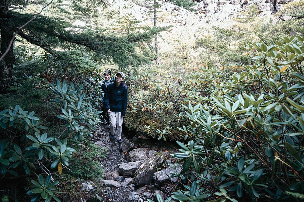 平坦な登山道から緩やかな登り坂へと変わるころ、シラビソの森から少しずつ植生も移り変わる。トレイルの両脇にはシャクナゲが目立つようになり、まるでトンネルのように登山道を囲い、勢いよく茂る。