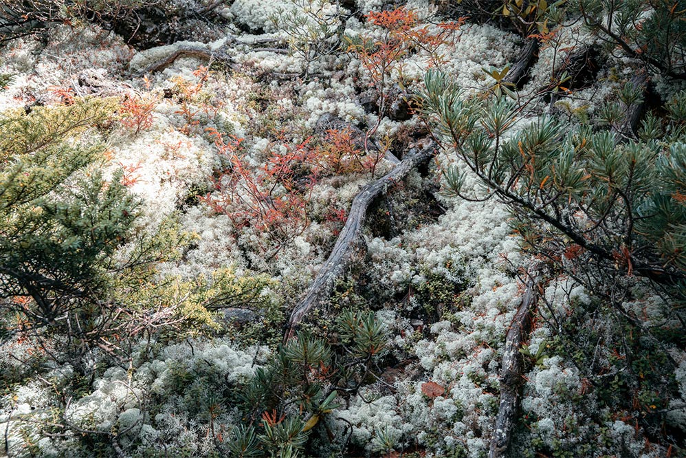 真っ白な地衣類が地面を覆う。赤みを帯びてきた草木と、まだまだ夏の面影を残す緑。多彩な自然の色が見られるのも、この季節ならでは。この森ならでは。