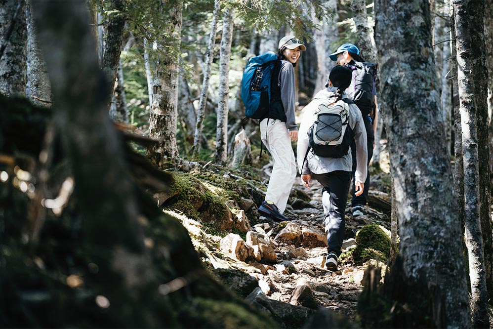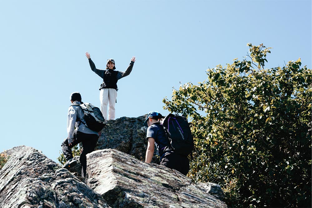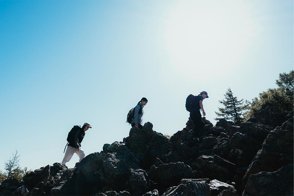 岩場を登りきると、ふたたび樹林のなかへと入る。今度は急な坂が続く、なかなかハードなトレイルだ。だけど日帰りなので荷物も軽いし足元も軽快。歩きながらも会話に花が咲き、登りのつらさも忘れるほど。みんなで登れば山登りはいつだって楽しい。