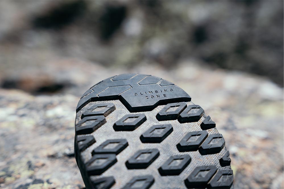 アプローチシューズであるため、爪先部分には幅を広くとったクライミングゾーンも搭載されている。これにより岩に立ち込む際も滑らずグリップし、小さな凹凸にも足を乗せられるのはアプローチシューズの強み。岩稜なら絶対的に安心感は勝る。